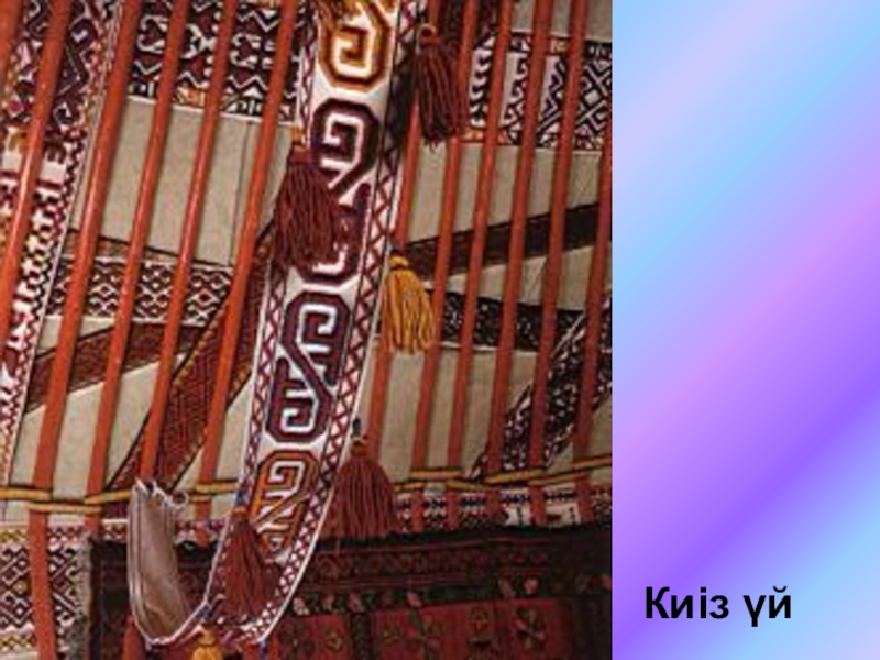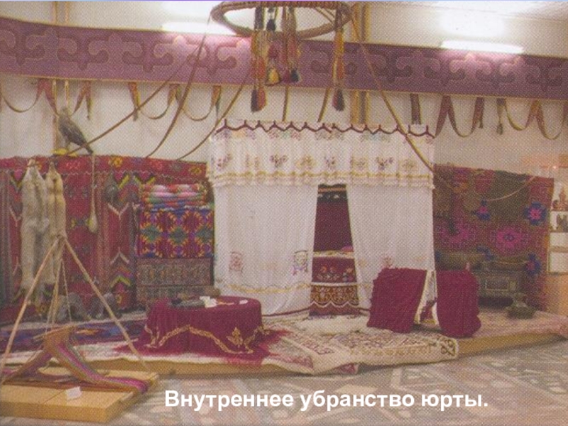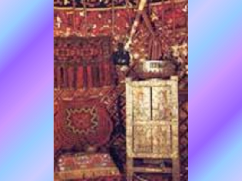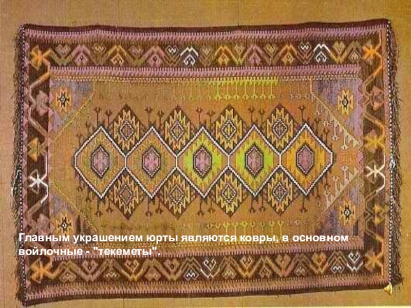 Слайд 38Главным украшением юрты являются ковры, в основном войлочные - "текеметы".