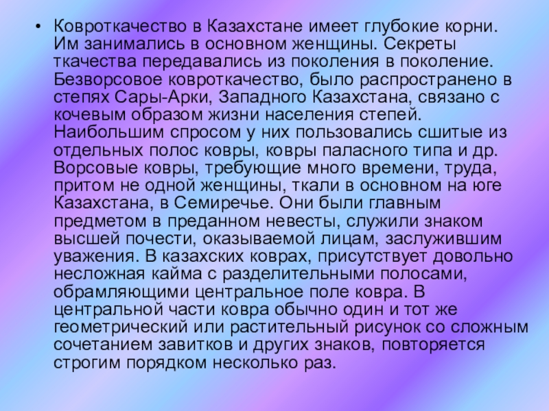 Слайд 39Ковроткачество в Казахстане имеет глубокие корни. Им занимались в основном женщины.