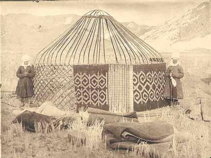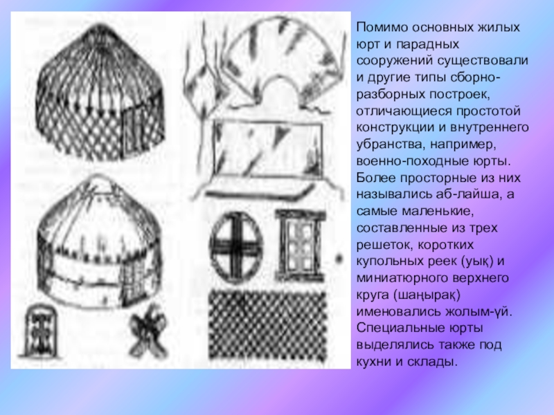 сборно-разборных построек, отличающиеся простотой конструкции и внутреннего убранства, например, военно-походные юрты. Более просторные из них назывались аб-лайша, а самые маленькие, составленные из трех решеток, коротких купольных реек (уық) и миниатюрного верхнего круга (шаңырақ) именовались жолым-үй. Специальные юрты выделялись также под кухни и склады.