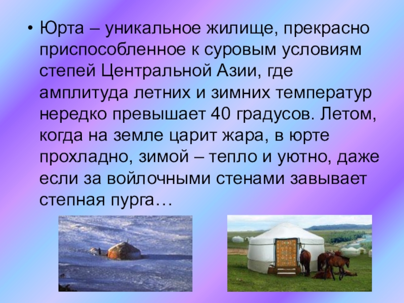 Слайд 62Юрта – уникальное жилище, прекрасно приспособленное к суровым условиям степей Центральной
