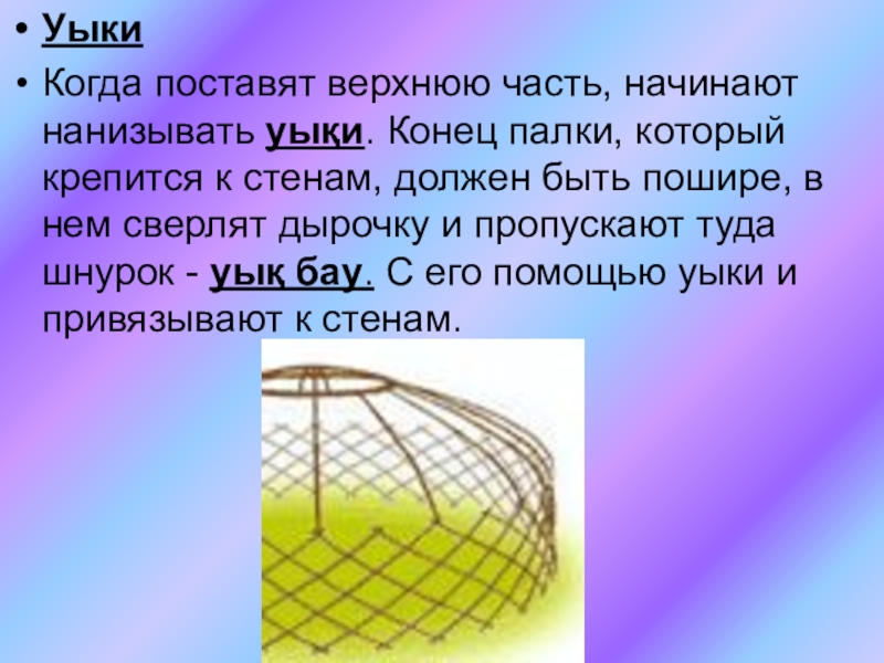 Когда поставят верхнюю часть, начинают нанизывать уықи. Конец палки, который