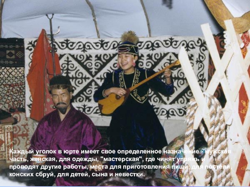 Слайд 34Каждый уголок в юрте имеет свое определенное назначение - мужская часть,
