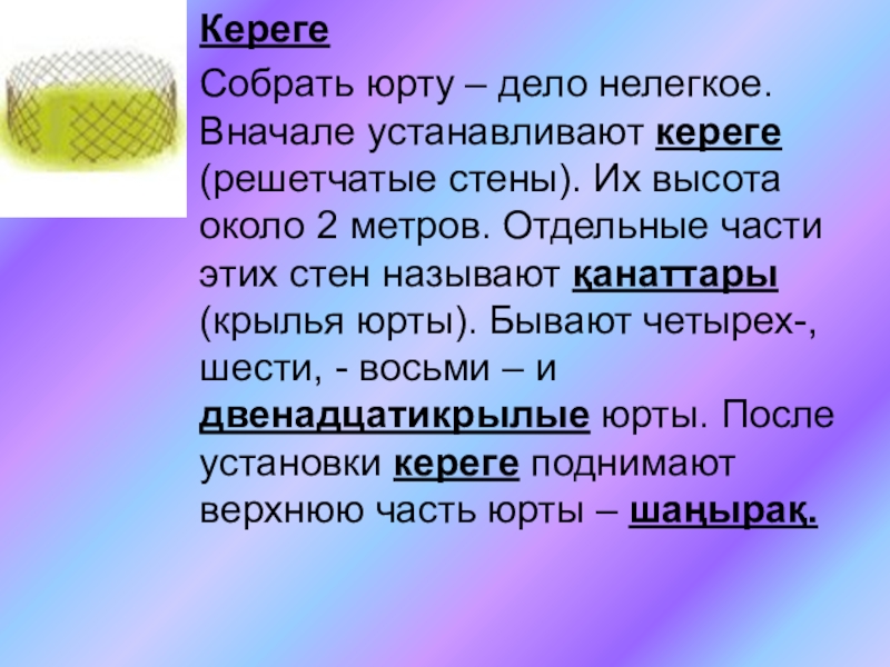 Их высота около 2 метров. Отдельные части этих стен называют қанаттары (крылья юрты). Бывают четырех-, шести, - восьми – и двенадцатикрылые юрты. После установки кереге поднимают верхнюю часть юрты – шаңырақ.