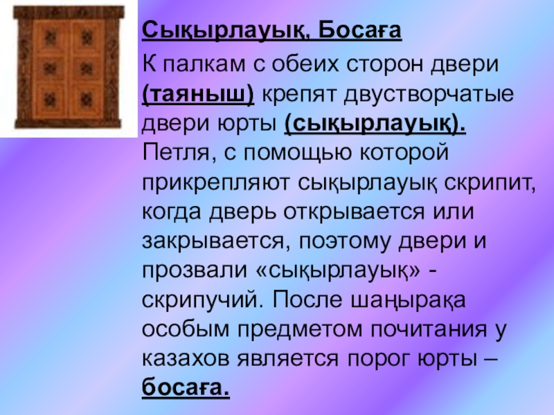 двери юрты (сықырлауық). Петля, с помощью которой прикрепляют сықырлауық скрипит, когда дверь открывается или закрывается, поэтому двери и прозвали «сықырлауық» - скрипучий. После шаңырақа особым предметом почитания у казахов является порог юрты – босаға.