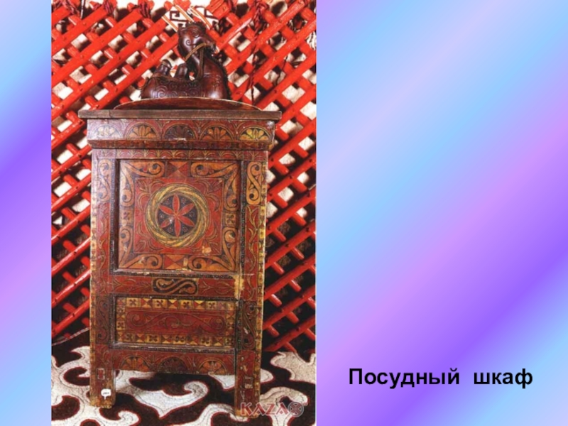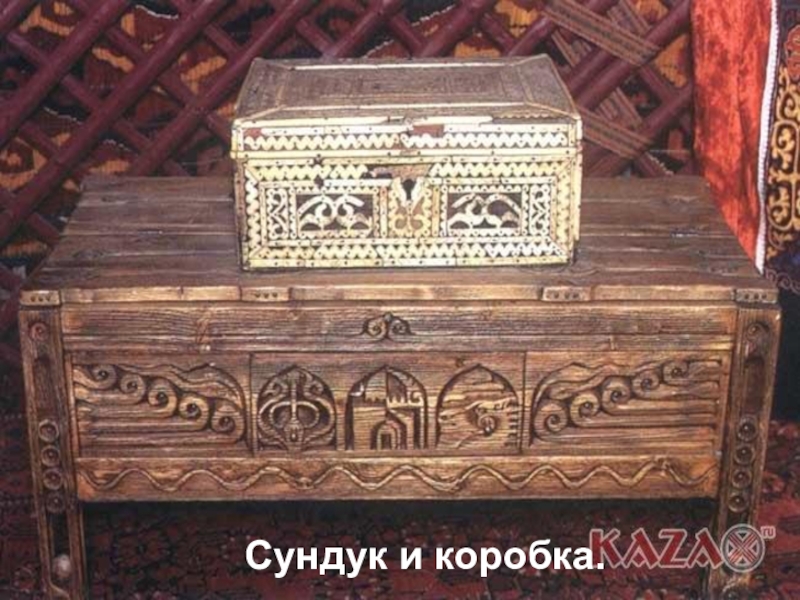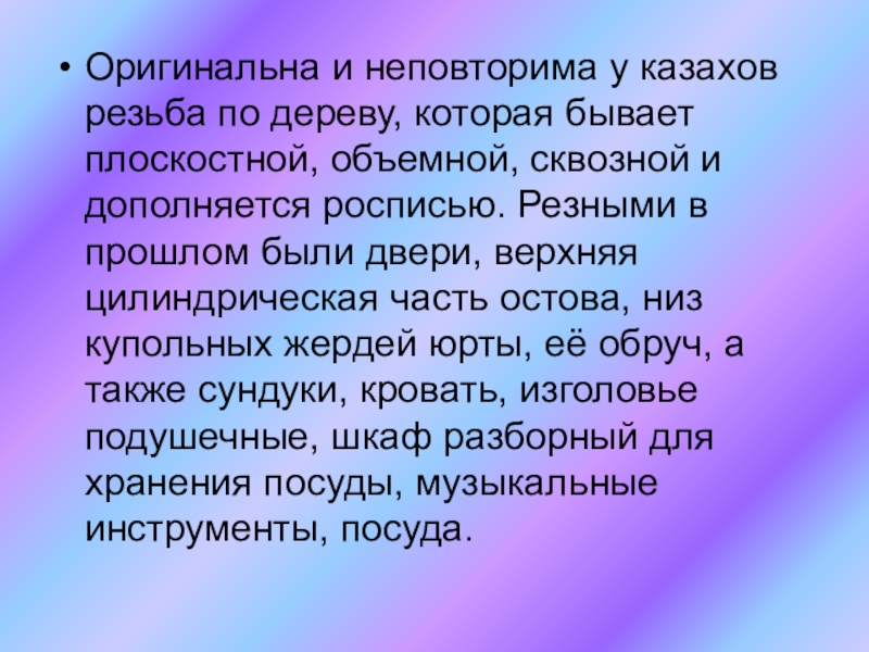 Слайд 42Оригинальна и неповторима у казахов резьба по дереву, которая бывает плоскостной,