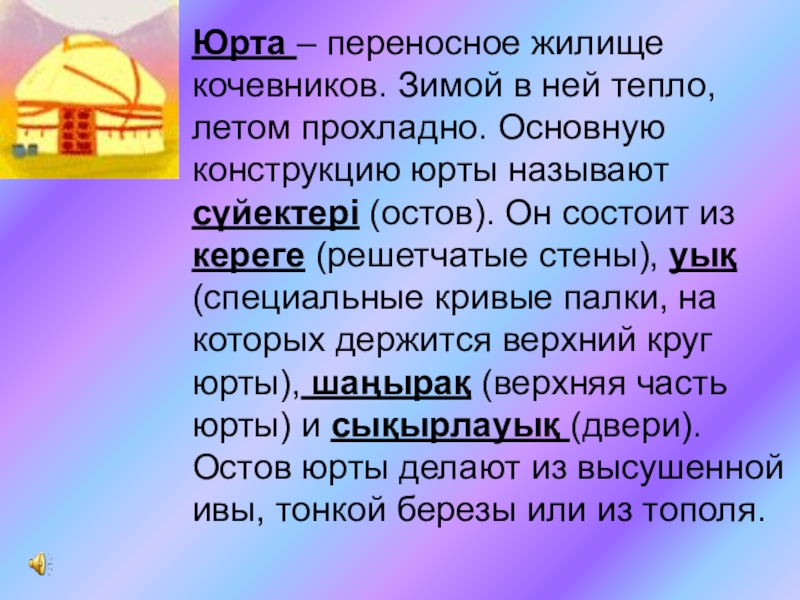 Слайд 10Юрта – переносное жилище кочевников. Зимой в ней тепло, летом прохладно.
