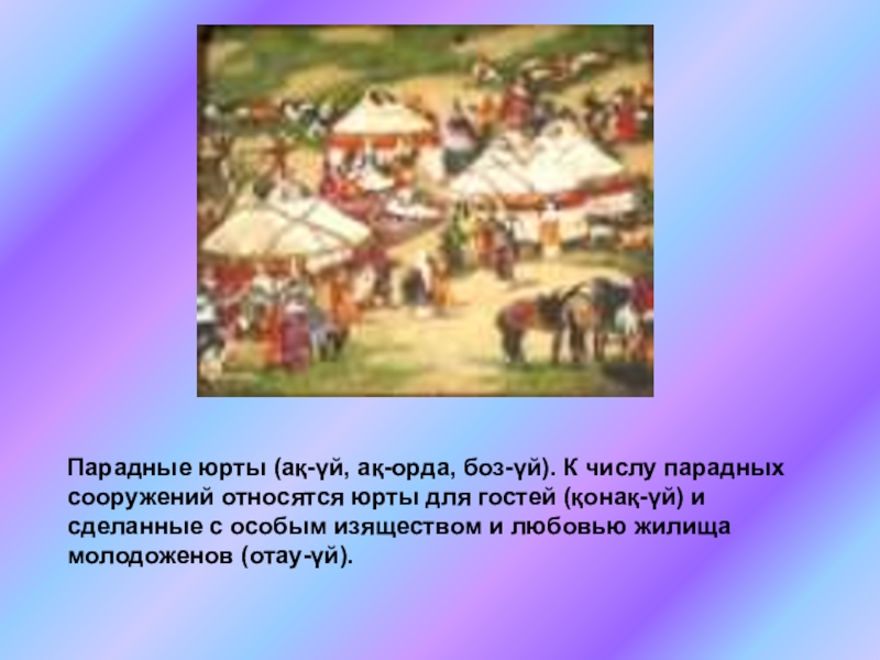 Слайд 7Парадные юрты (ақ-үй, ақ-орда, боз-үй). К числу парадных сооружений относятся юрты