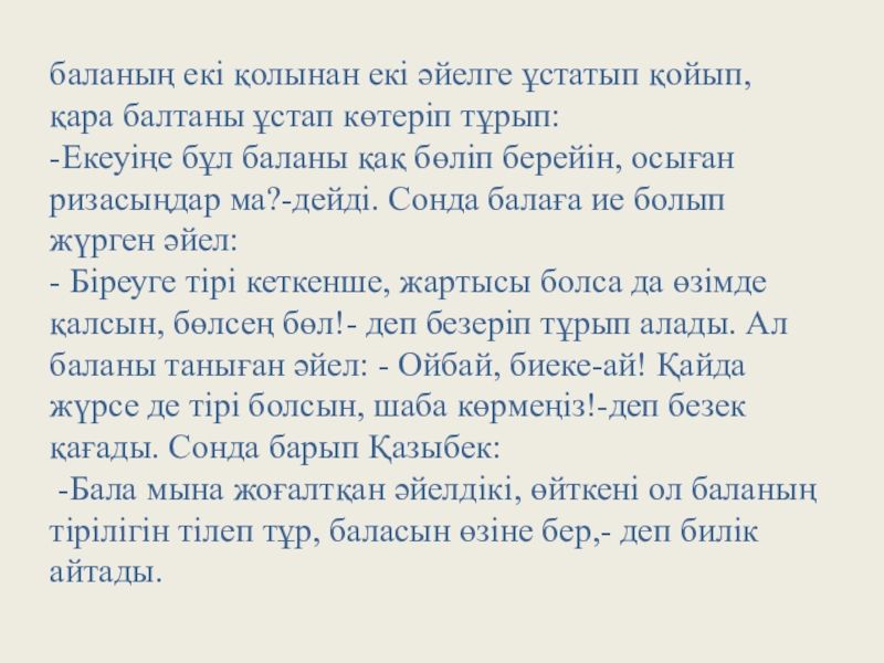 баланың екі қолынан екі әйелге ұстатып қойып, қара балтаны ұстап көтеріп тұрып:-Екеуіңе бұл баланы қақ бөліп