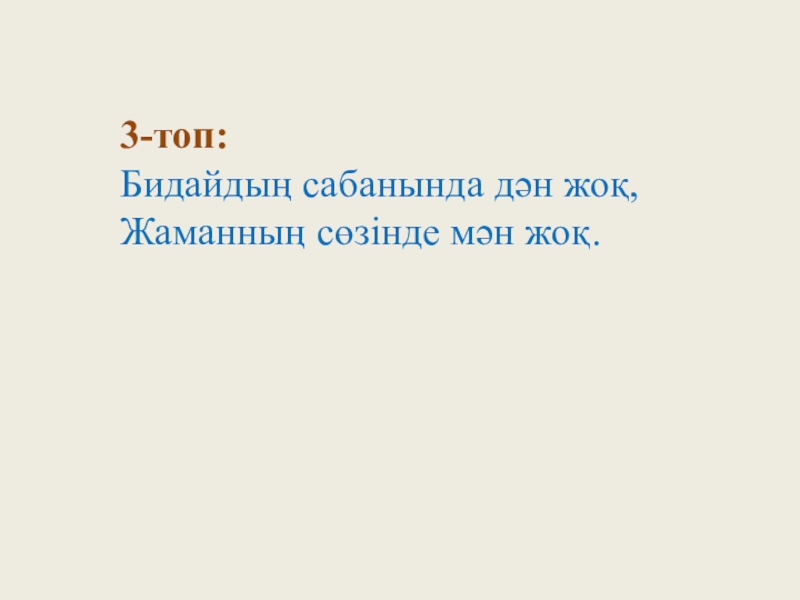 3-топ:Бидайдың сабанында дән жоқ,Жаманның сөзінде мән жоқ.