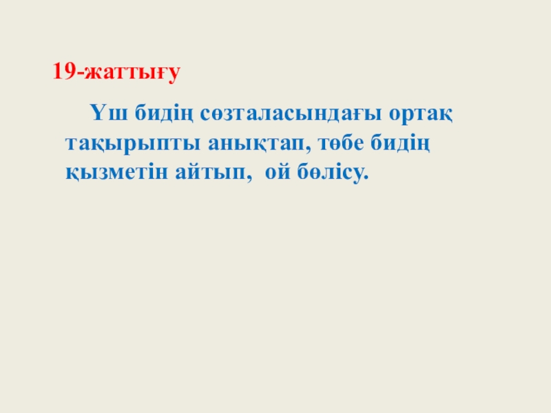 19-жаттығу  Үш бидің сөзталасындағы ортақ тақырыпты анықтап, төбе бидің қызметін айтып, ой бөлісу.