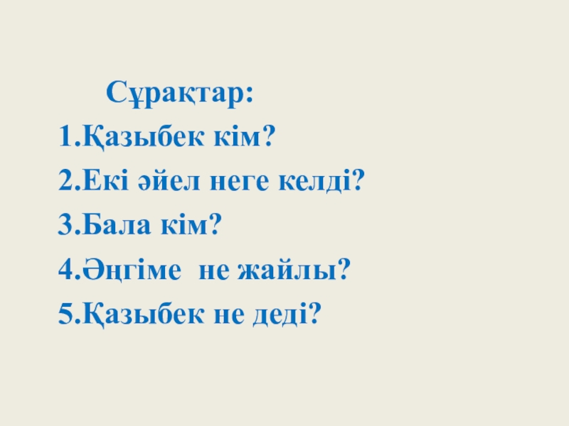 Сұрақтар:  1.Қазыбек кім?  2.Екі әйел неге келді?  3.Бала