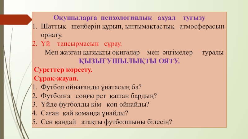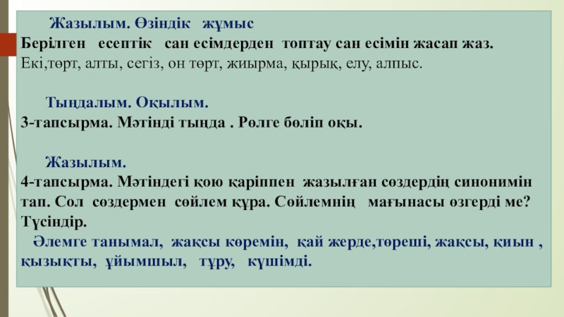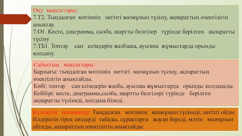 Күтілетін нәтижелер: Тыңдалған мәтіннің мазмұнын түсінеді, негізгі ойды білдіретін тірек сөздерді табады, сұрақтарға жауап береді, мәтін мазмұнын айтады, ақпараттың өзектілігін анықтайды.