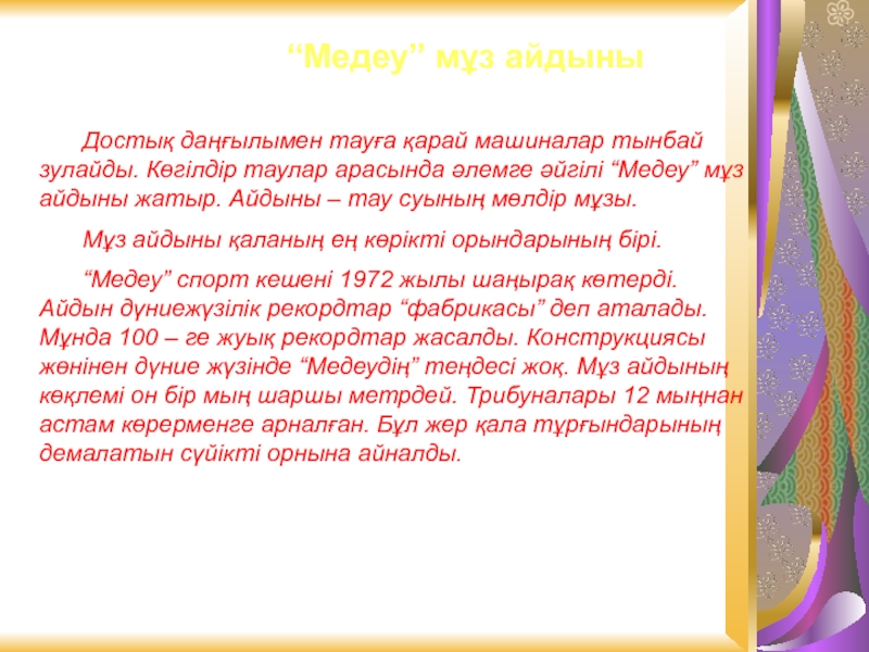 Презентация, доклад по казахскому языку на тему Медеу мұз айдыны