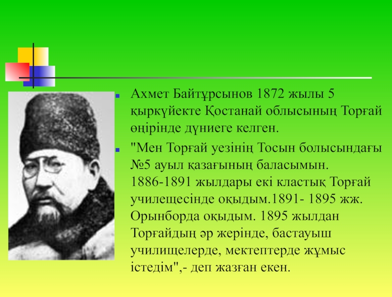 Слайд 3Ахмет Байтұрсынов 1872 жылы 5 қыркүйекте Қостанай облысының Торғай өңірінде дүниеге
