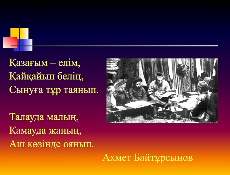 Қазағым – елім,Қайқайып белің,Сынуға тұр таянып.Талауда малың,Камауда жаның,Аш көзінде оянып.Ахмет Байтұрсынов