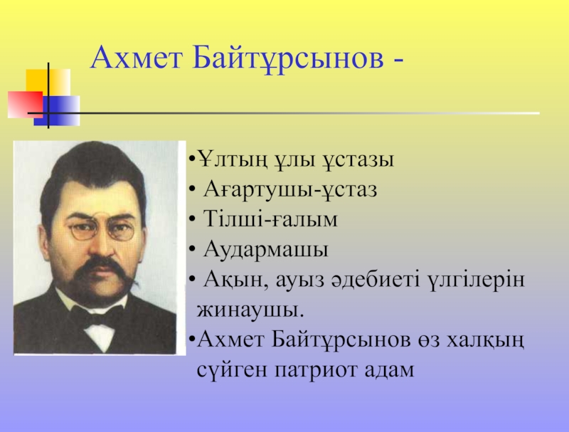 Ахмет Байтұрсынов -Ұлтың ұлы ұстазы Ағартушы-ұстаз Тілші-ғалым Аудармашы Ақын, ауыз әдебиеті үлгілерін жинаушы.Ахмет Байтұрсынов өз халқың сүйген патриот адам