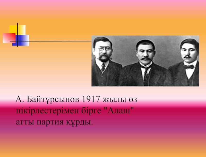 Слайд 6 А. Байтұрсынов 1917 жылы өз пікірлестерімен бірге "Алаш" атты