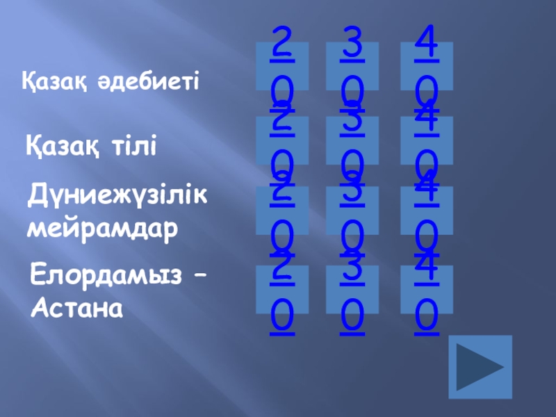 20Қазақ әдебиетіҚазақ тілі3040Дүниежүзілік мейрамдарЕлордамыз – Астана203040203040203040