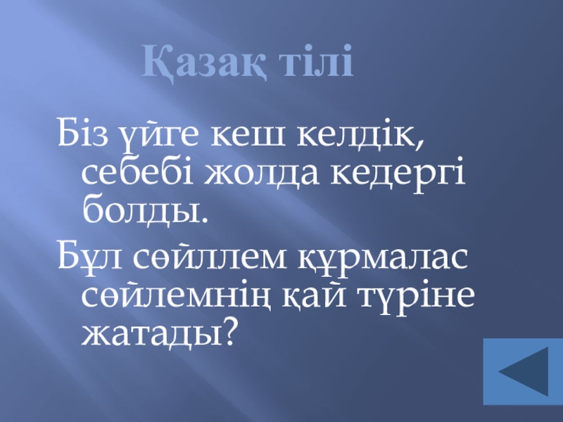 Қазақ тіліБіз үйге кеш келдік,себебі жолда кедергі болды.Бұл сөйллем құрмалас сөйлемнің қай түріне жатады?