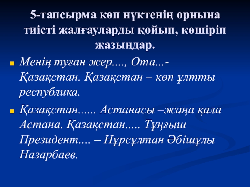 Слайд 85-тапсырма көп нүктенің орнына тиісті жалғауларды қойып, көшіріп жазыңдар.