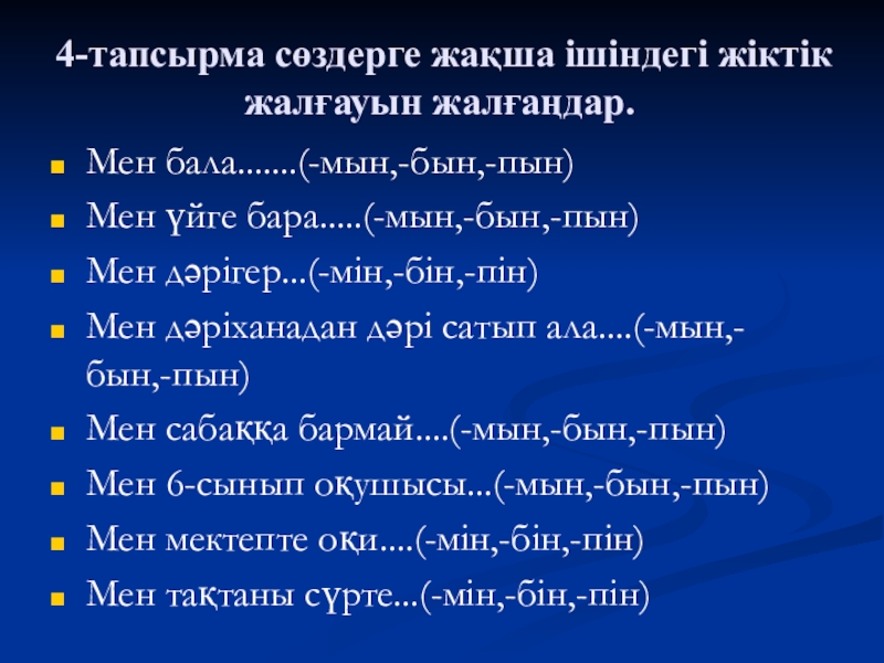 Мен сабаққа бармай....(-мын,-бын,-пын)