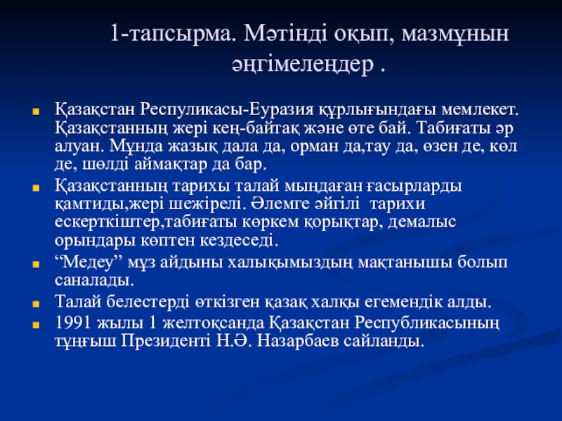 Слайд 41-тапсырма. Мәтінді оқып, мазмұнын әңгімелеңдер .