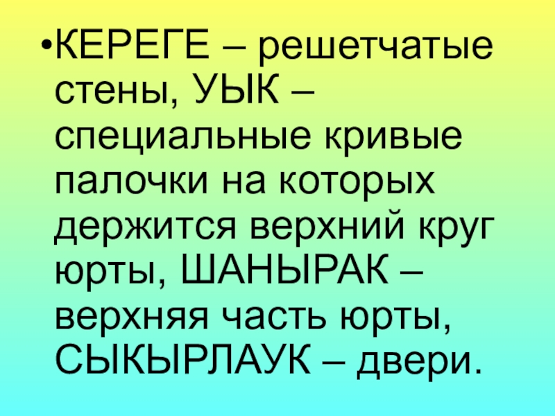 Слайд 39КЕРЕГЕ – решетчатые стены, УЫК –специальные кривые палочки на которых держится