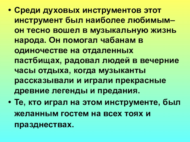в музыкальную жизнь народа. Он помогал чабанам в одиночестве на отдаленных пастбищах, радовал людей в вечерние часы отдыха, когда музыканты рассказывали и играли прекрасные древние легенды и предания.