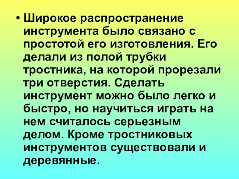 из полой трубки тростника, на которой прорезали три отверстия. Сделать инструмент можно было легко и быстро, но научиться играть на нем считалось серьезным делом. Кроме тростниковых инструментов существовали и деревянные.