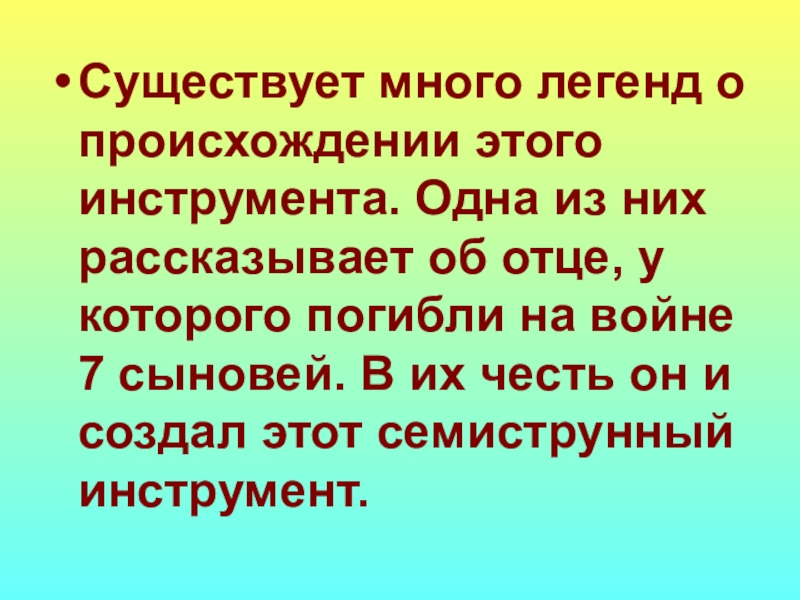 Слайд 23Существует много легенд о происхождении этого инструмента. Одна из них рассказывает