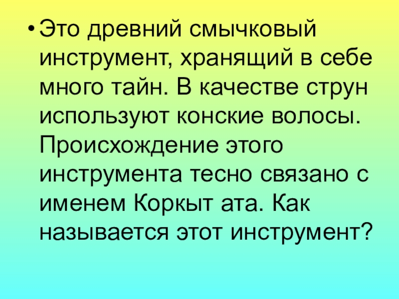 струн используют конские волосы. Происхождение этого инструмента тесно связано с именем Коркыт ата. Как называется этот инструмент?