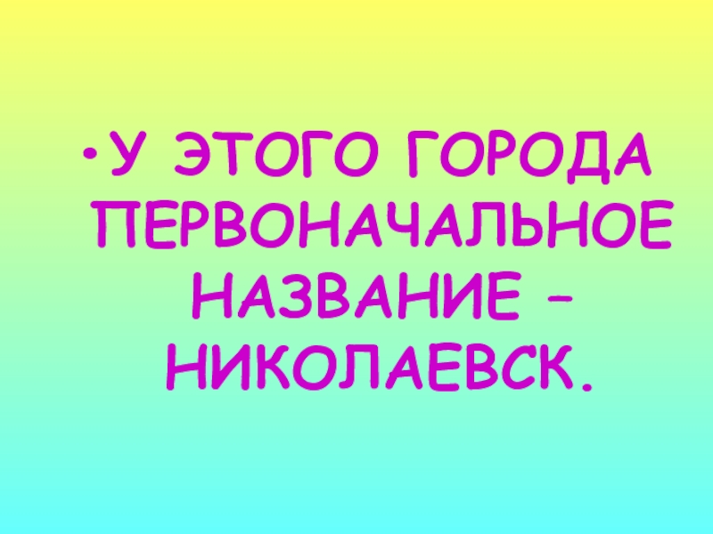 Слайд 76У ЭТОГО ГОРОДА ПЕРВОНАЧАЛЬНОЕ НАЗВАНИЕ – НИКОЛАЕВСК.