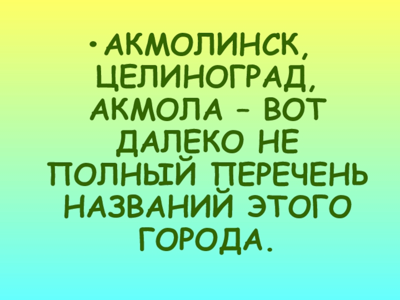 Слайд 72АКМОЛИНСК, ЦЕЛИНОГРАД, АКМОЛА – ВОТ ДАЛЕКО НЕ ПОЛНЫЙ ПЕРЕЧЕНЬ НАЗВАНИЙ ЭТОГО
