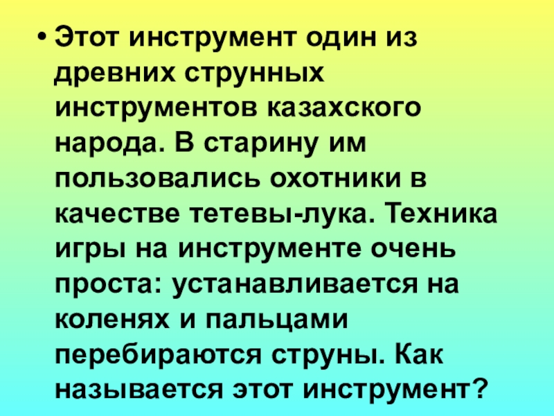 Слайд 6Этот инструмент один из древних струнных инструментов казахского народа. В старину