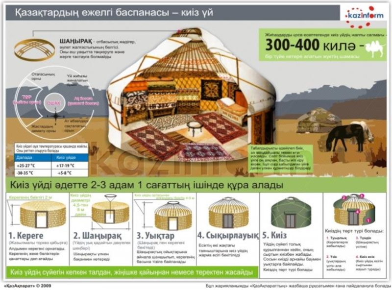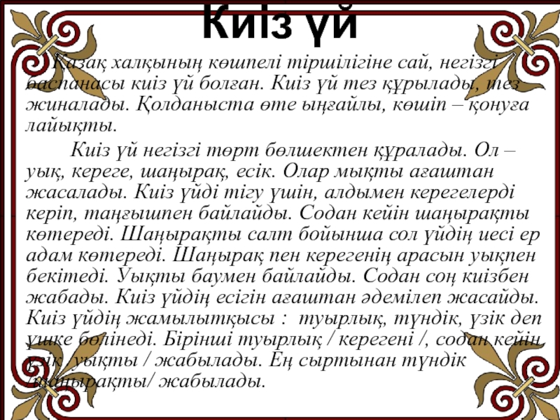Киіз үй      Қазақ халқының көшпелі тіршілігіне сай, негізгі баспанасы киіз үй болған.