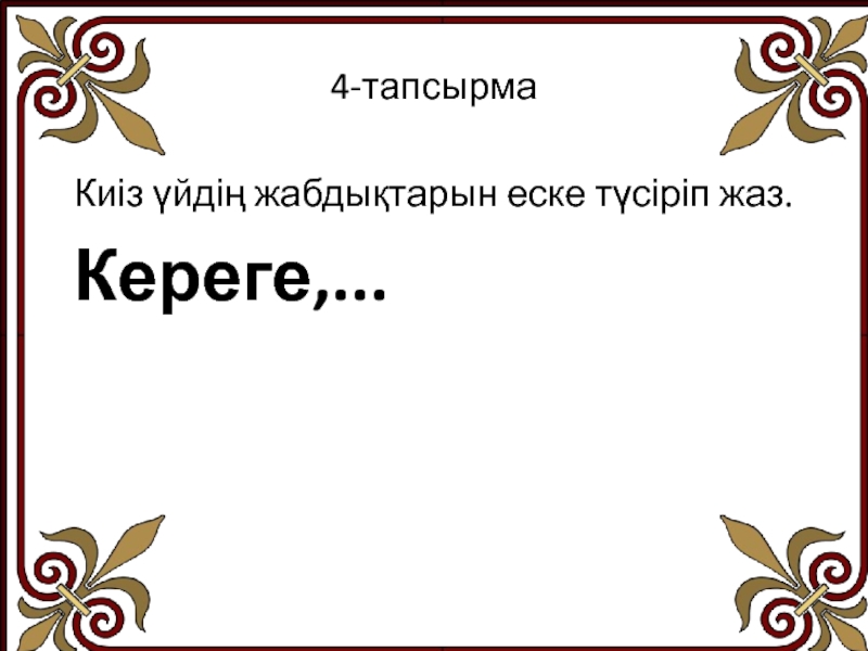 4-тапсырмаКиіз үйдің жабдықтарын еске түсіріп жаз.Кереге,...