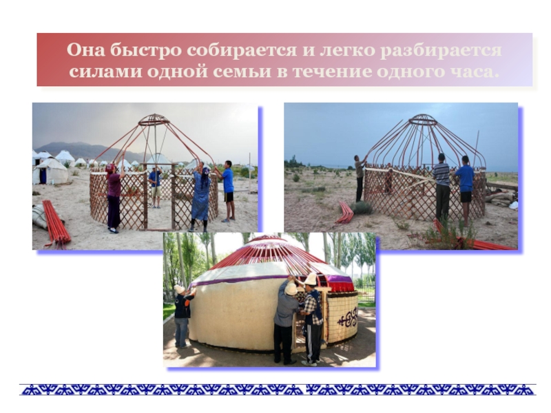 Слайд 25Она быстро собирается и легко разбирается силами одной семьи в течение