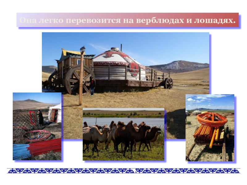 Слайд 26Она легко перевозится на верблюдах и лошадях.
