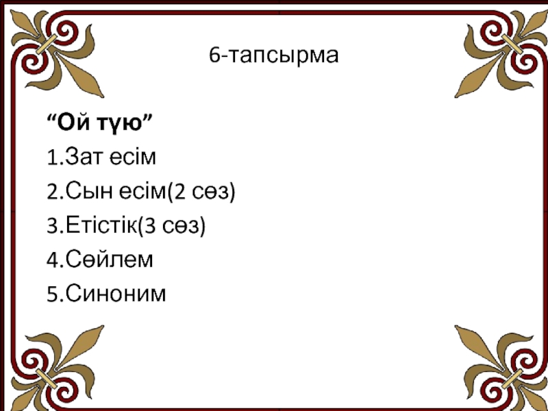 6-тапсырма“Ой түю”1.Зат есім2.Сын есім(2 сөз)3.Етістік(3 сөз)4.Сөйлем5.Синоним