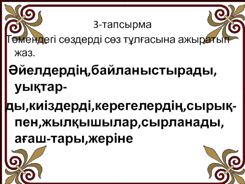 3-тапсырмаТөмендегі сөздерді сөз тұлғасына ажыратып жаз. Әйелдердің,байланыстырады,уықтар-ды,киіздерді,керегелердің,сырық-пен,жылқышылар,сырланады,ағаш-тары,жеріне
