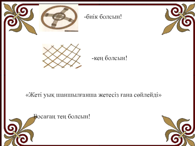-биік болсын!-кең болсын!«Жетi уық шаншылғанша жетесiз ғана сөйлейдi» Босағаң тең болсын!