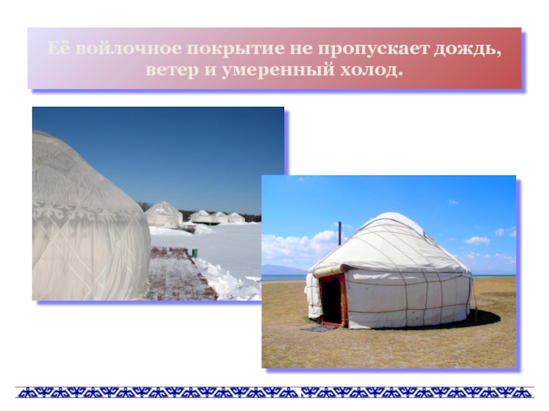 Слайд 27Её войлочное покрытие не пропускает дождь, ветер и умеренный холод.