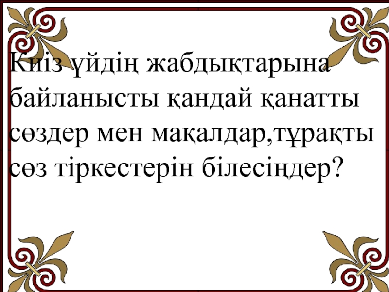 Слайд 32Киіз үйдің жабдықтарына байланысты қандай қанатты сөздер мен мақалдар,тұрақты сөз тіркестерін