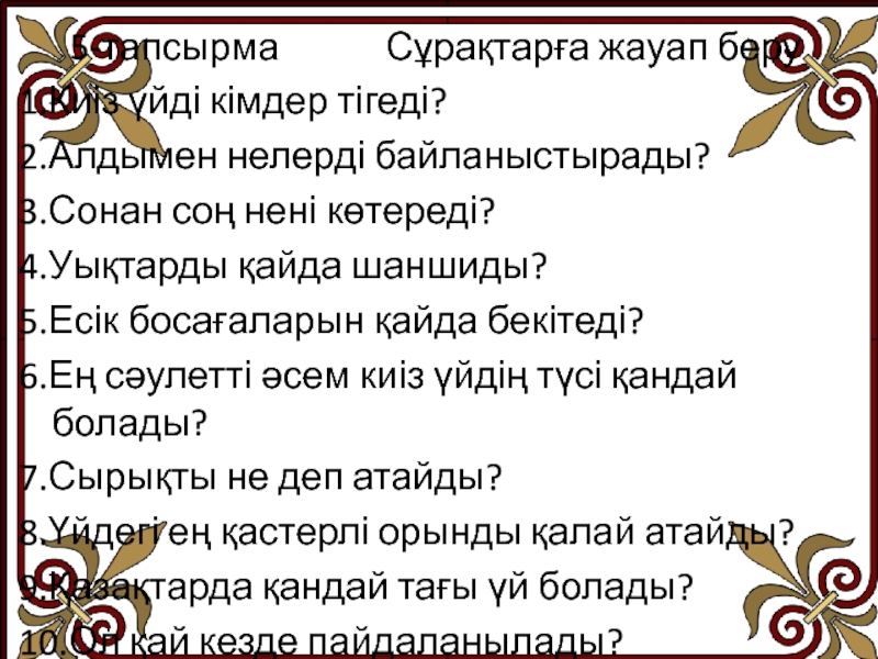 Слайд 195-тапсырма Сұрақтарға жауап беру