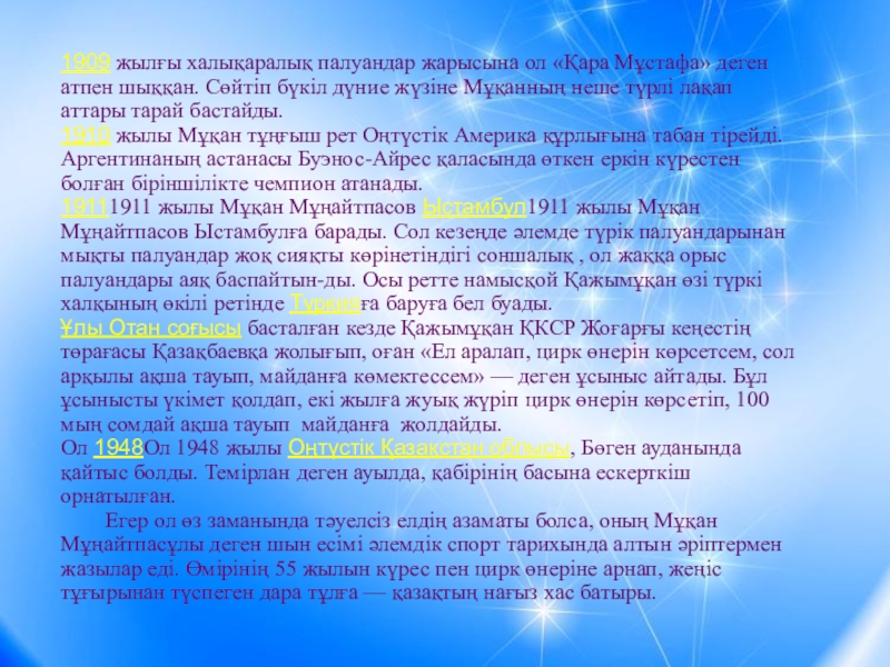 Слайд 131909 жылғы халықаралық палуандар жарысына ол «Қара Мұстафа» деген атпен шыққан.