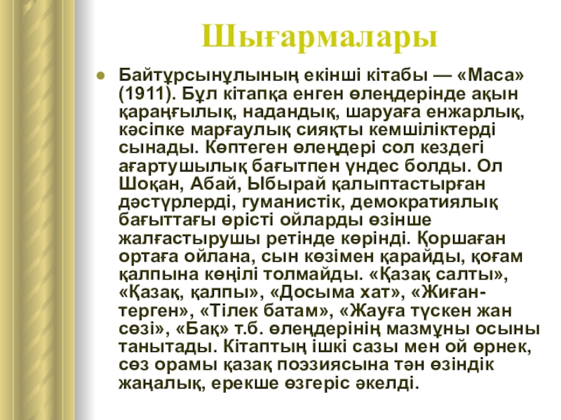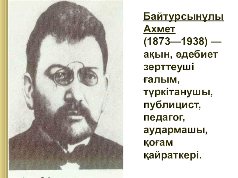 Слайд 14 Байтурсынұлы Ахмет (1873—1938) — ақын, әдебиет зерттеуші ғалым, түркітанушы,