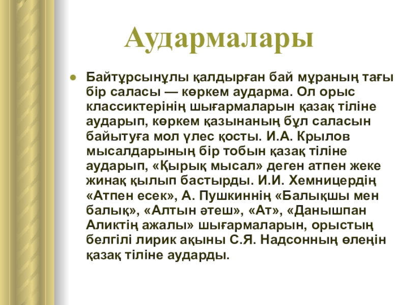 — көркем аударма. Ол орыс классиктерінің шығармаларын қазақ тіліне аударып, көркем қазынаның бұл саласын байытуға мол үлес қосты. И.А. Крылов мысалдарының бір тобын қазақ тіліне аударып, «Қырық мысал» деген атпен жеке жинақ қылып бастырды. И.И. Хемницердің «Атпен есек», А. Пушкиннің «Балықшы мен балық», «Алтын әтеш», «Ат», «Данышпан Аликтің ажалы» шығармаларын, орыстың белгілі лирик ақыны С.Я. Надсонның өлеңін қазақ тіліне аударды.
