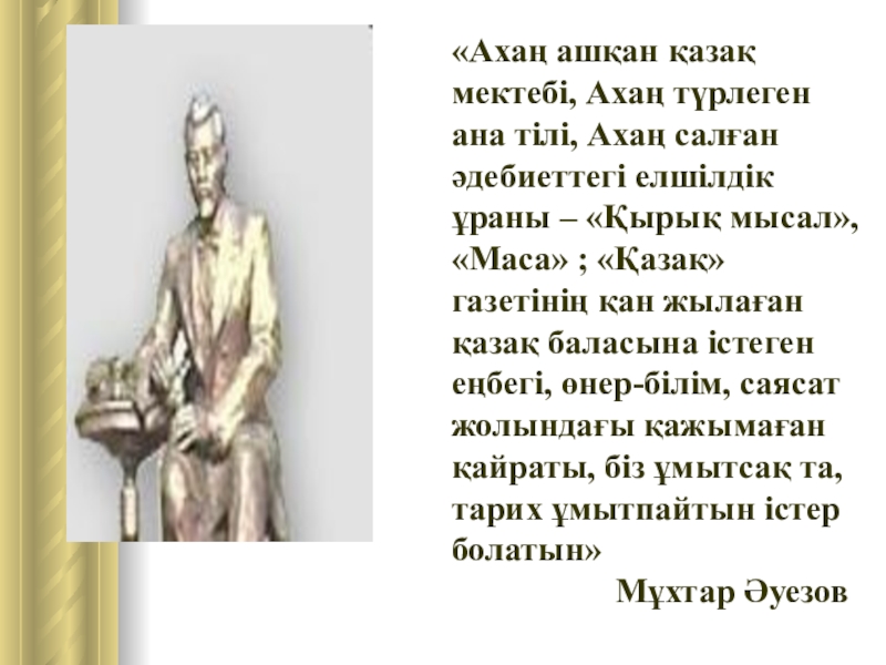 ашқан қазақ мектебі, Ахаң түрлеген ана тілі, Ахаң салған әдебиеттегі елшілдік ұраны – «Қырық мысал», «Маса» ; «Қазақ» газетінің қан жылаған қазақ баласына істеген еңбегі, өнер-білім, саясат жолындағы қажымаған қайраты, біз ұмытсақ та, тарих ұмытпайтын істер болатын»