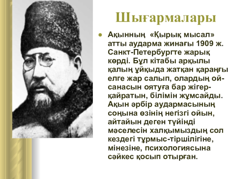 Ақынның «Қырық мысал» атты аударма жинағы 1909 ж. Санкт-Петербургте