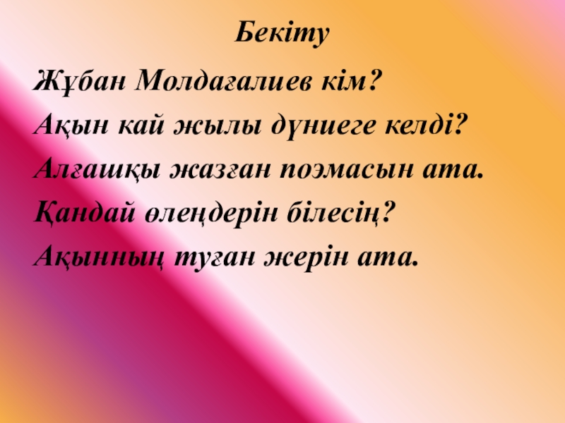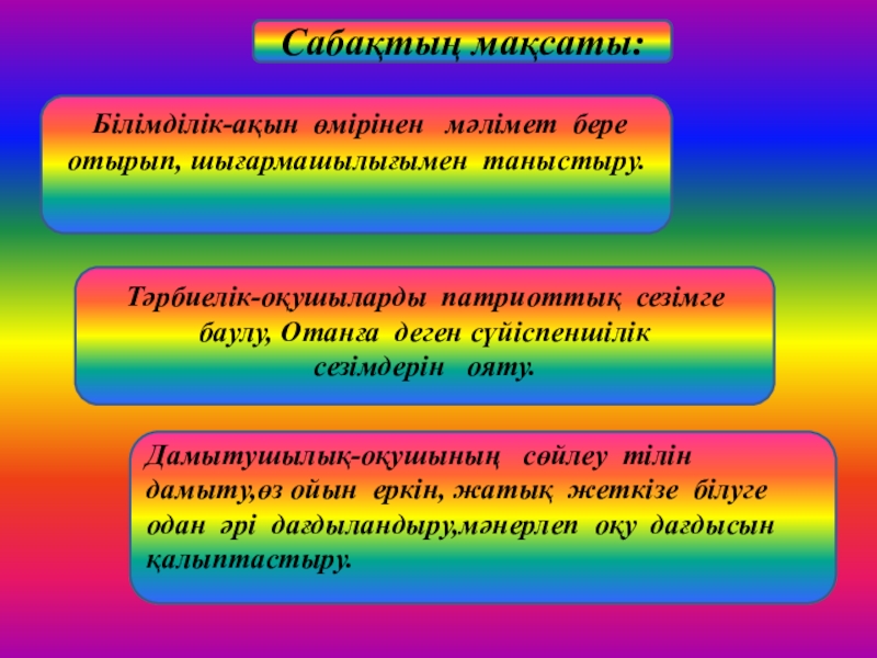 Білімділік-ақын өмірінен мәлімет бере отырып, шығармашылығымен таныстыру.